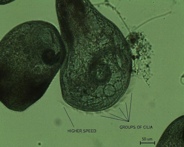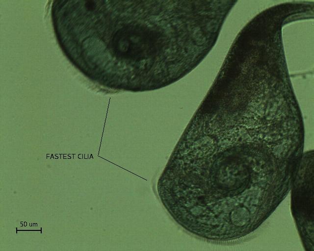 So it is possible to estimate that the cilia are about 10um long and the peristome is about 20um in diameter. The peristome is a region around the cytostome ("mouth" of a protozoan), which receives the food. The food particles get there because the Stentor, using their cilia surrounding the oral surface, creates a vortex.