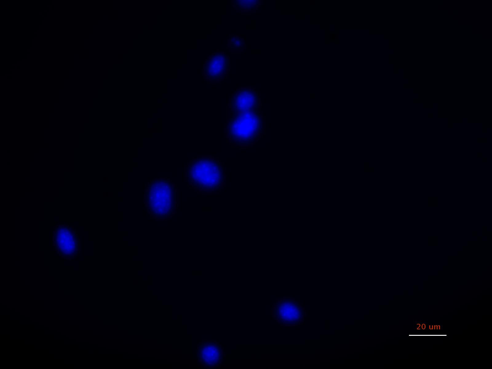 A fibroblast is a cell that makes the structural fibers and ground substance of connective tissue. Fibroblasts have a branched cytoplasm surrounding an elliptical, speckled nucleus having 1 or 2 nucleoli. They can can give rise to other cells, such as bone cells, fat cells, and smooth muscle cells. The fact that fibroblasts easily proliferate makes them a popular cell type for cell cultures in biological research. The following pictures were taken using the Zeiss microscope (40x). The actin was stained with FITC, and the mitochondria with Texas Red