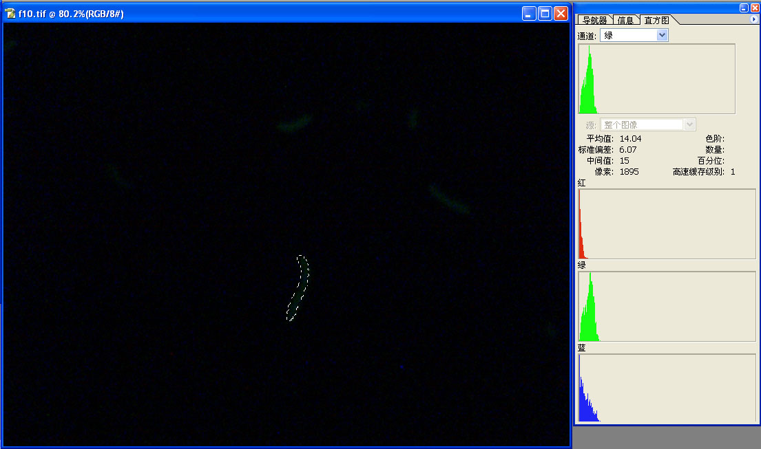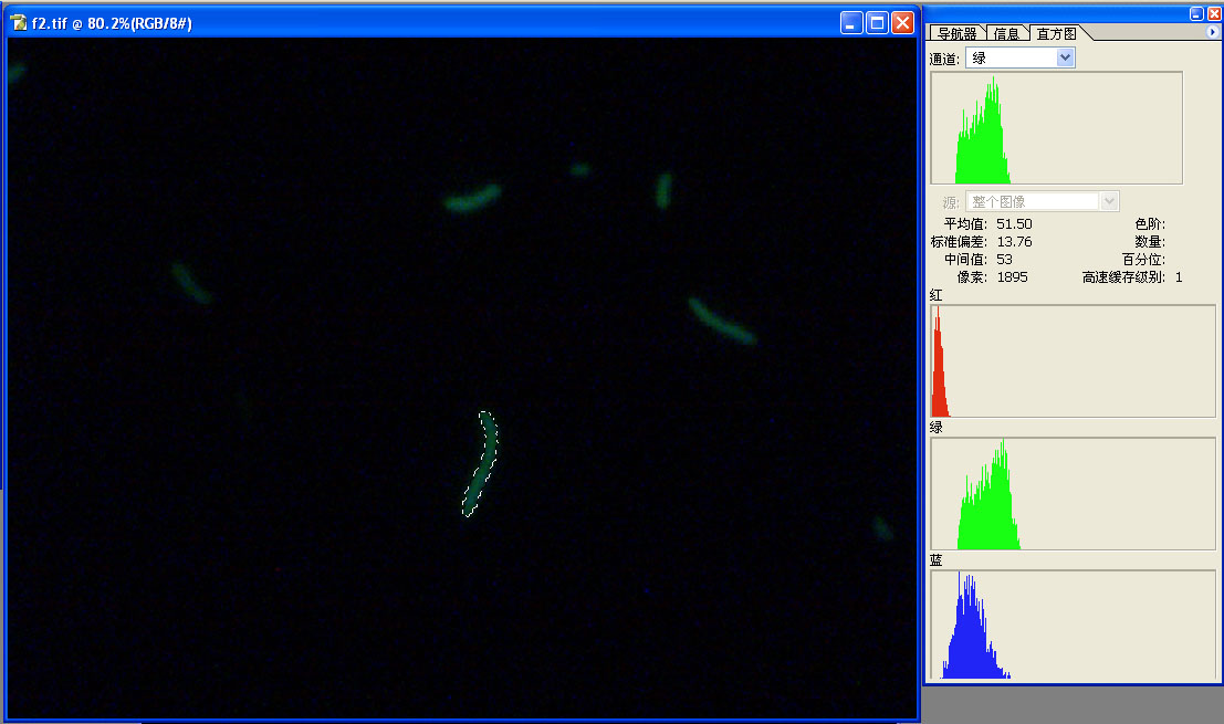 To analyse the image, we use photoshop to select only the areaes of the E. Coli cell at center in all images. We find the green channel histogram of the area and the average pixel intensity.