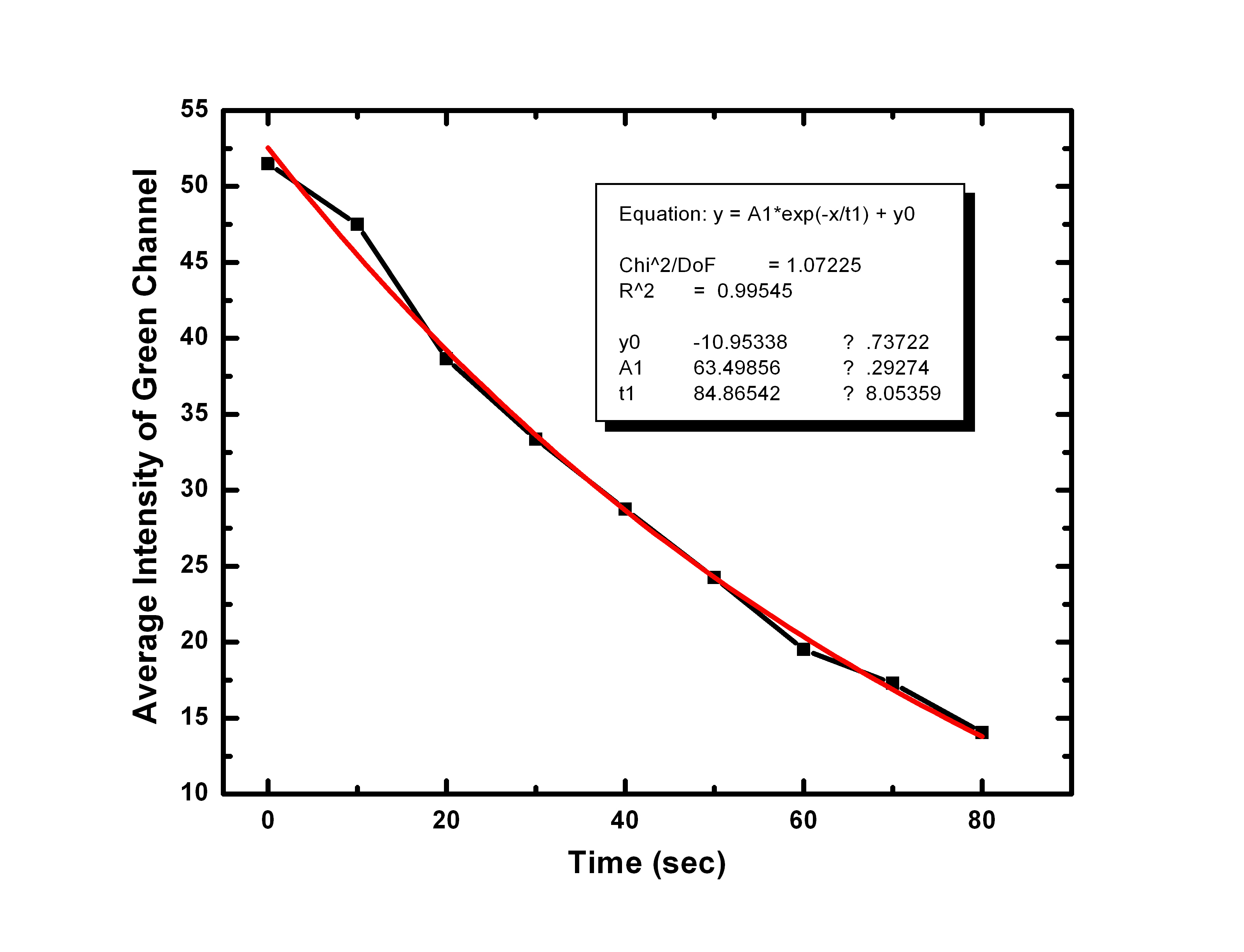 From the average pixel intensity in selected areas, we plot the light intensity over time. We fit the data to a single mode exponential decay and we calcalculate the time constant of the process to be around 85 seconds.