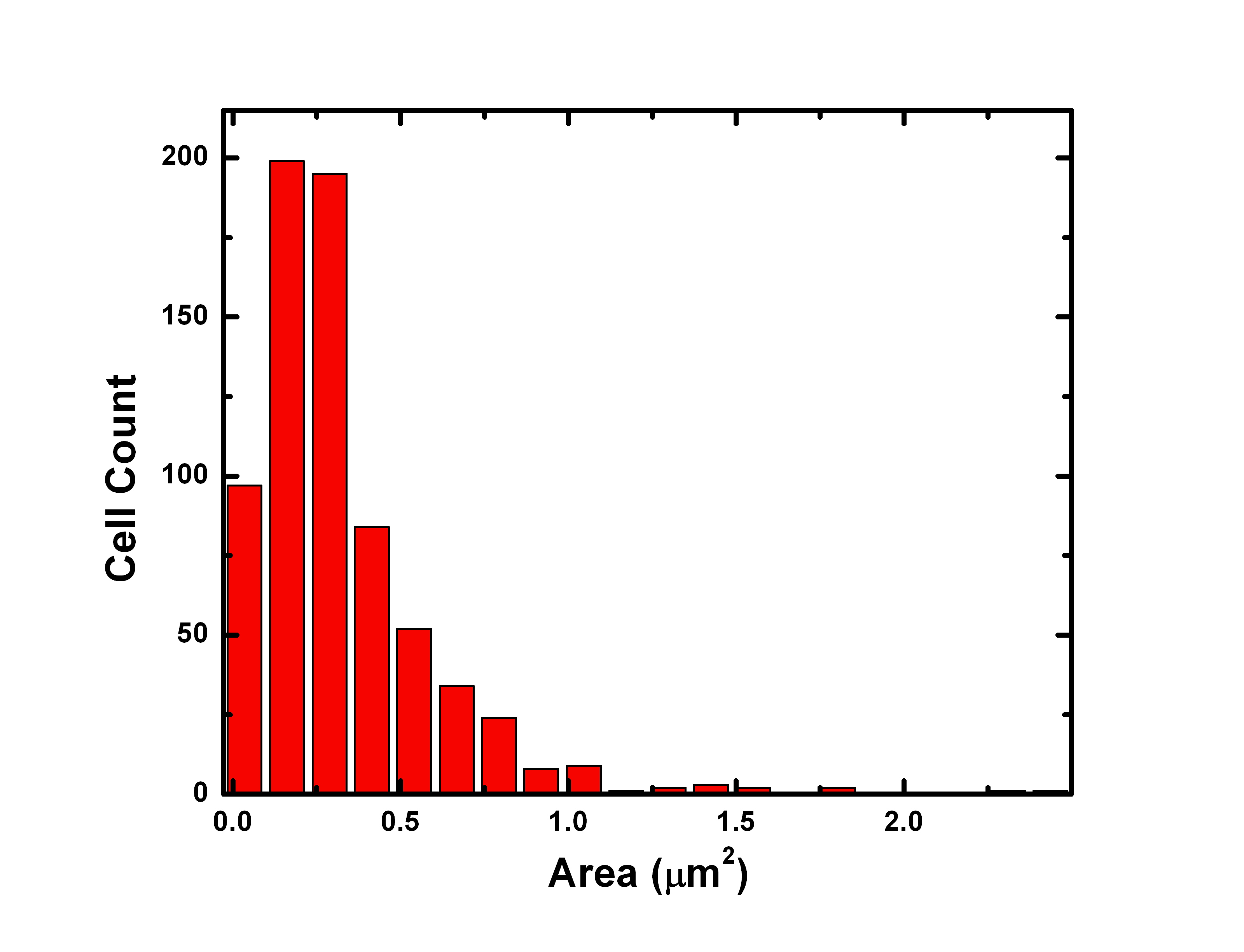 | Plot of particle size distribution. A total of 714 particles are counted with average area of 0.388 ¦Ìm^2. Assuming circular cross section of cells, this converts to 0.7 ¦Ìm diameter. The major error comes from thresholding. Because the cells are not in the same focusing plane, the threshold operation shrink some of the unfocused cells to very small size which reduces the average area of particle. |